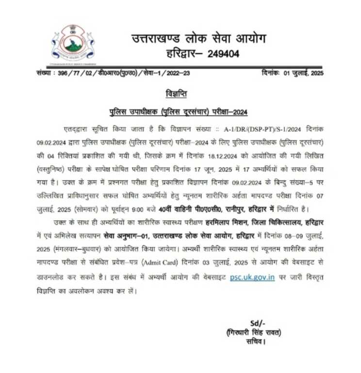 एतद्वारा सूचित किया जाता है कि विज्ञापन संख्या A-1/DR/(DSP-PT)/S-1/2024 दिनांक 09.02.2024 द्वारा पुलिस उपाधीक्षक (पुलिस दूरसंचार) परीक्षा-2024 के लिए पुलिस उपाधीक्षक (पुलिस दूरसंचार) की 04 रिक्तियां प्रकाशित की गयी थी, जिसके क्रम में दिनांक 18.12.2024 को आयोजित की गयी लिखित (वस्तुनिष्ठ) परीक्षा के सापेक्ष घोषित परीक्षा परिणाम दिनांक 17 जून, 2025 में 17 अभ्यर्थियों को सफल किया गया है। उक्त के क्रम में प्रश्नगत परीक्षा हेतु प्रकाशित विज्ञापन दिनांक 09.02.2024 के बिन्दु संख्या 5 पर उल्लिखित प्राविधानुसार सफल घोषित अभ्यर्थियों हेतु न्यूनतम शारीरिक अर्हता मापदण्ड परीक्षा दिनांक 07 जुलाई, 2025 (सोमवार) को पूर्वाह्न 9:00 बजे 40वीं वाहिनी पी०ए०सी०, रानीपुर, हरिद्वार में निर्धारित है।