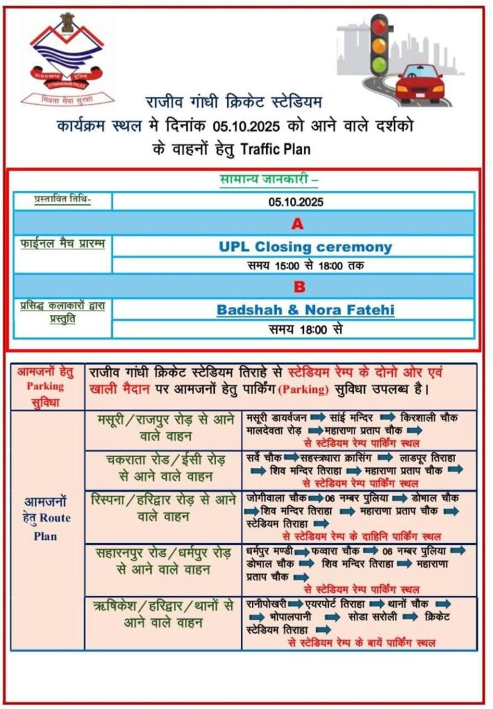UPL के समापन कार्यक्रम को देखते हुए पुलिस प्रशासन ने सुरक्षा और यातायात की विशेष योजना बनाई है। भारी भीड़ की आशंका को देखते हुए स्टेडियम के आसपास ट्रैफिक कंट्रोल, पार्किंग और प्रवेश व्यवस्था के लिए व्यापक इंतजाम किए गए हैं।