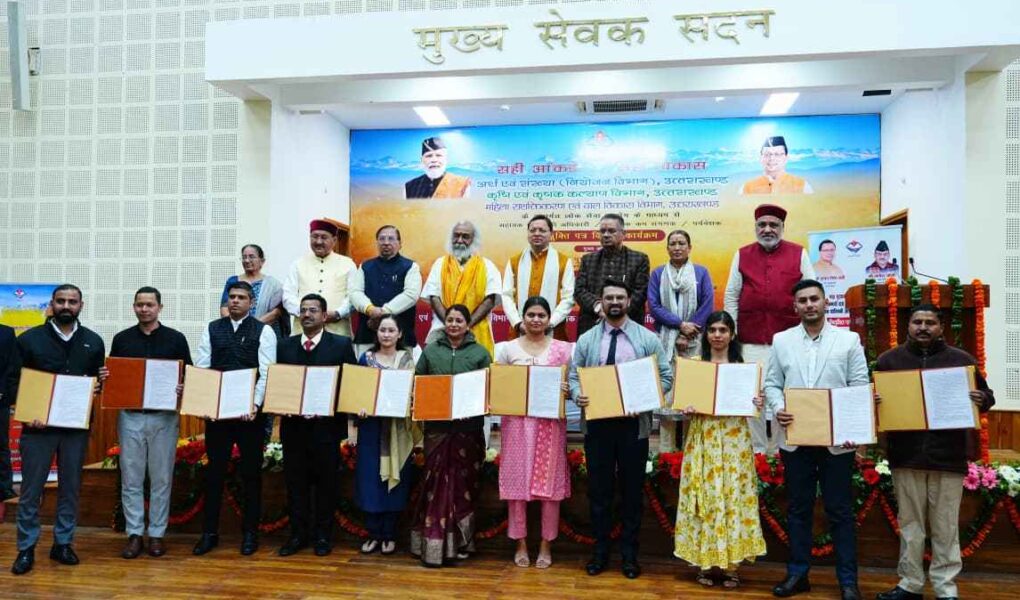मुख्यमंत्री पुष्कर सिंह धामी ने गुरूवार को मुख्यमंत्री कैम्प कार्यालय स्थित मुख्य सेवक सदन में आयोजित कार्यक्रम में लोक सेवा आयोग के माध्यम से चयनित अर्थ एवं संख्या, कृषि एवं उद्यान तथा महिला सशक्तिकरण एवं बाल विकास विभाग के 178 अभ्यर्थियों को नियुक्ति पत्र प्रदान किए। जिसमें अर्थ एवं संख्या विभाग के 117, कृषि विभाग के 12 उद्यान विभाग के 30 तथा महिला सशक्तिकरण एवं बाल विकास विभाग के 19 अभ्यर्थी शामिल है। उन्होंने नवनियुक्त अभ्यर्थियों को बधाई देते हुए विश्वास व्यक्त किया कि सभी ईमानदारी, निष्ठा एवं समर्पण के साथ दायित्वों का निर्वहन कर उत्तराखंड को विकसित, आत्मनिर्भर एवं देश के अग्रणी राज्यों में शामिल करने के संकल्प को साकार करने में महत्वपूर्ण भूमिका निभाएँगे।