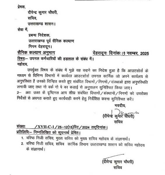 देहरादून: उपनल कर्मियों की हड़ताल क़ो लेकर शासन सख्त हुआ,और कार्यवाई के निर्देश दिए।आउटसोर्स के माध्यम से विभिन्न विभागों में कार्यरत आउटसोर्स उपनल कार्मिक जो अपने कार्यलय से अनुपस्थित हैं उनको चिन्हित करते हुए संबंधित विभागों / निगमों / संस्थाओं द्वारा अनुपस्थिति लगायी जाए तथा नो वर्क नो पे का कडाई से अनुपालन सुनिश्चित किया जाए।
